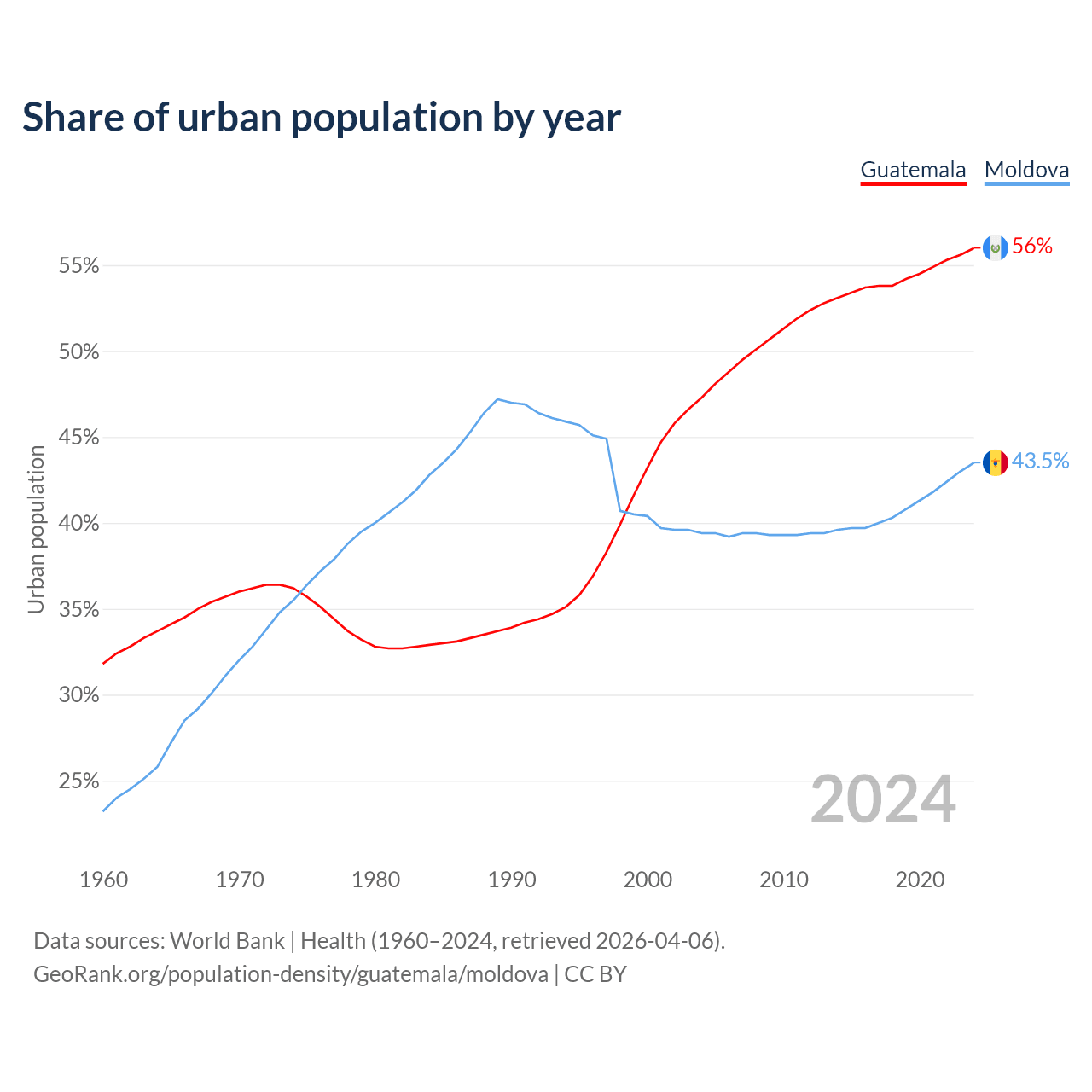 From 2004 to 2024, the share of urban population changed from 47.3% to 56% in Guatemala and from 39.4% to 43.5% in Moldova.