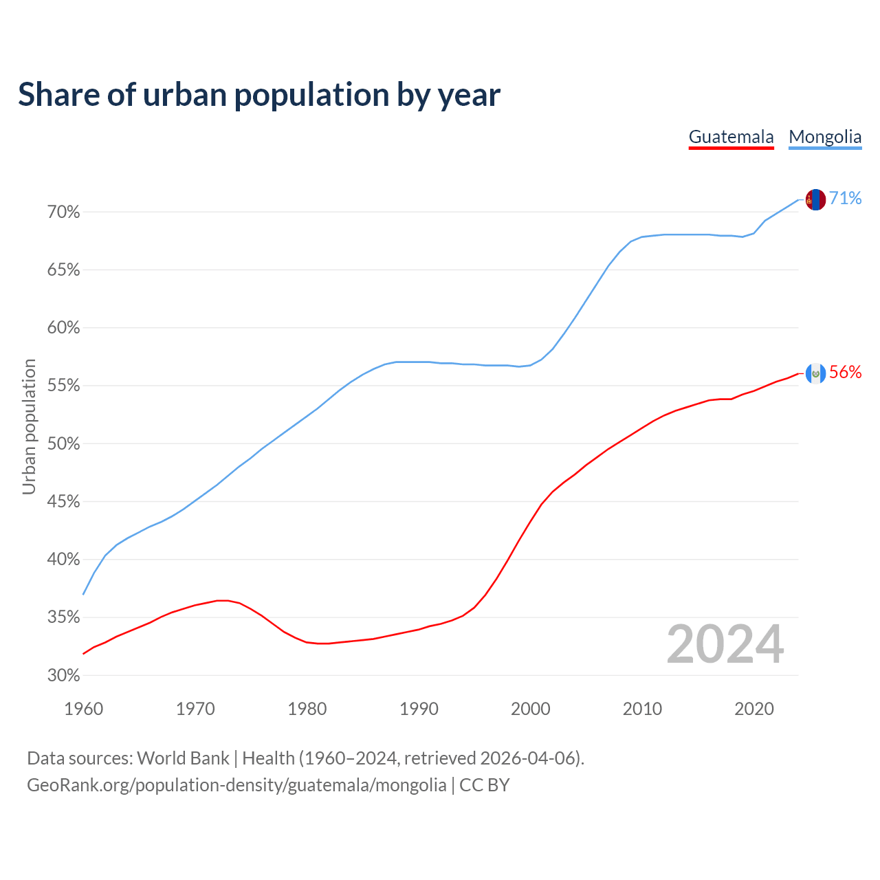 From 2004 to 2024, the share of urban population changed from 47.3% to 56% in Guatemala and from 60.8% to 71% in Mongolia.