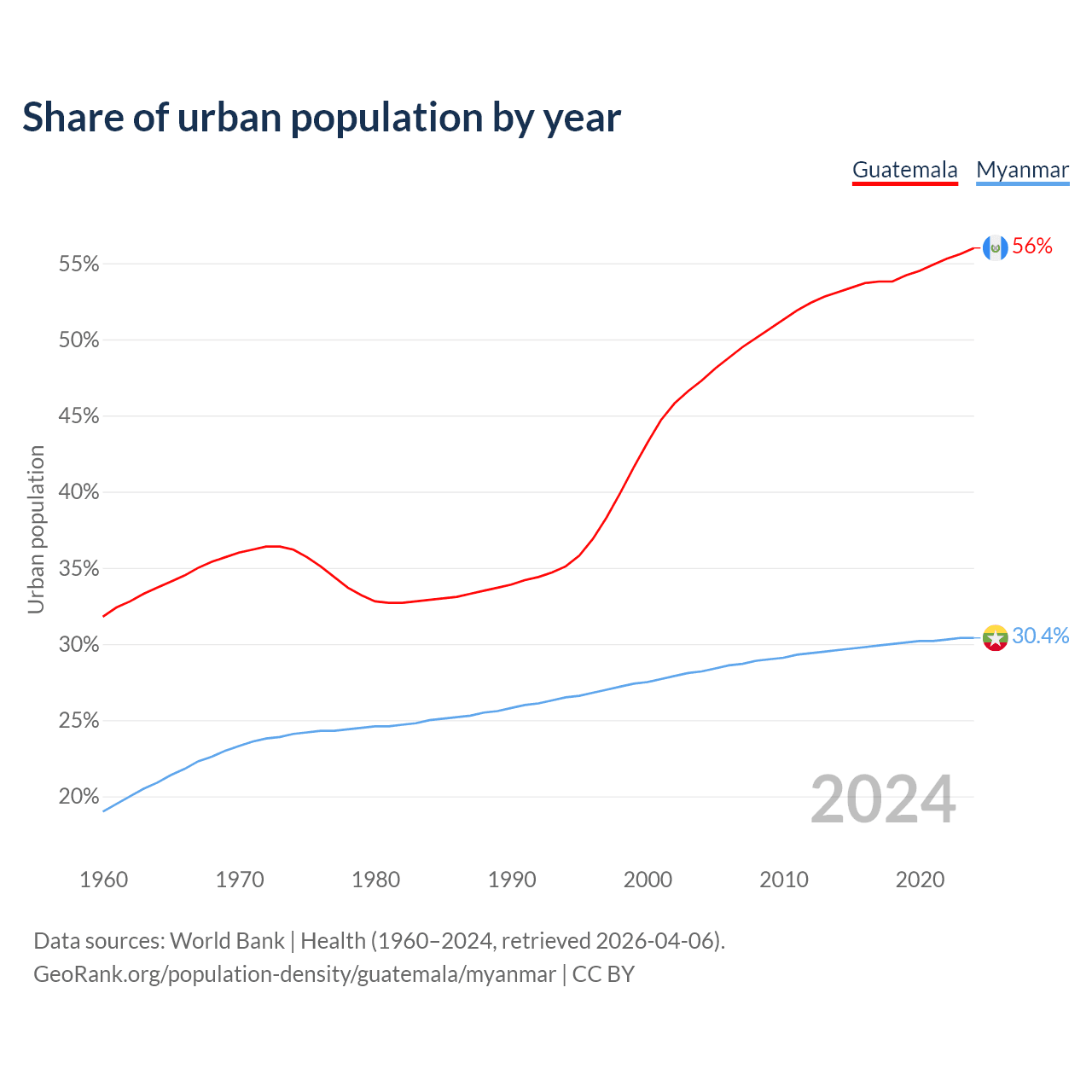 From 2004 to 2024, the share of urban population changed from 47.3% to 56% in Guatemala and from 28.2% to 30.4% in Myanmar.