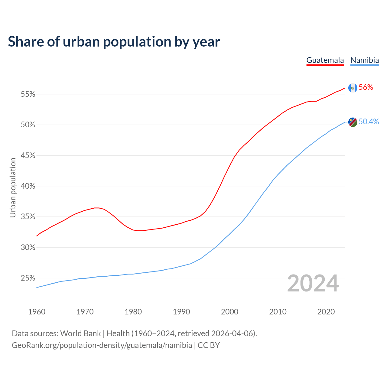 From 2004 to 2024, the share of urban population changed from 47.3% to 56% in Guatemala and from 35.5% to 50.4% in Namibia.