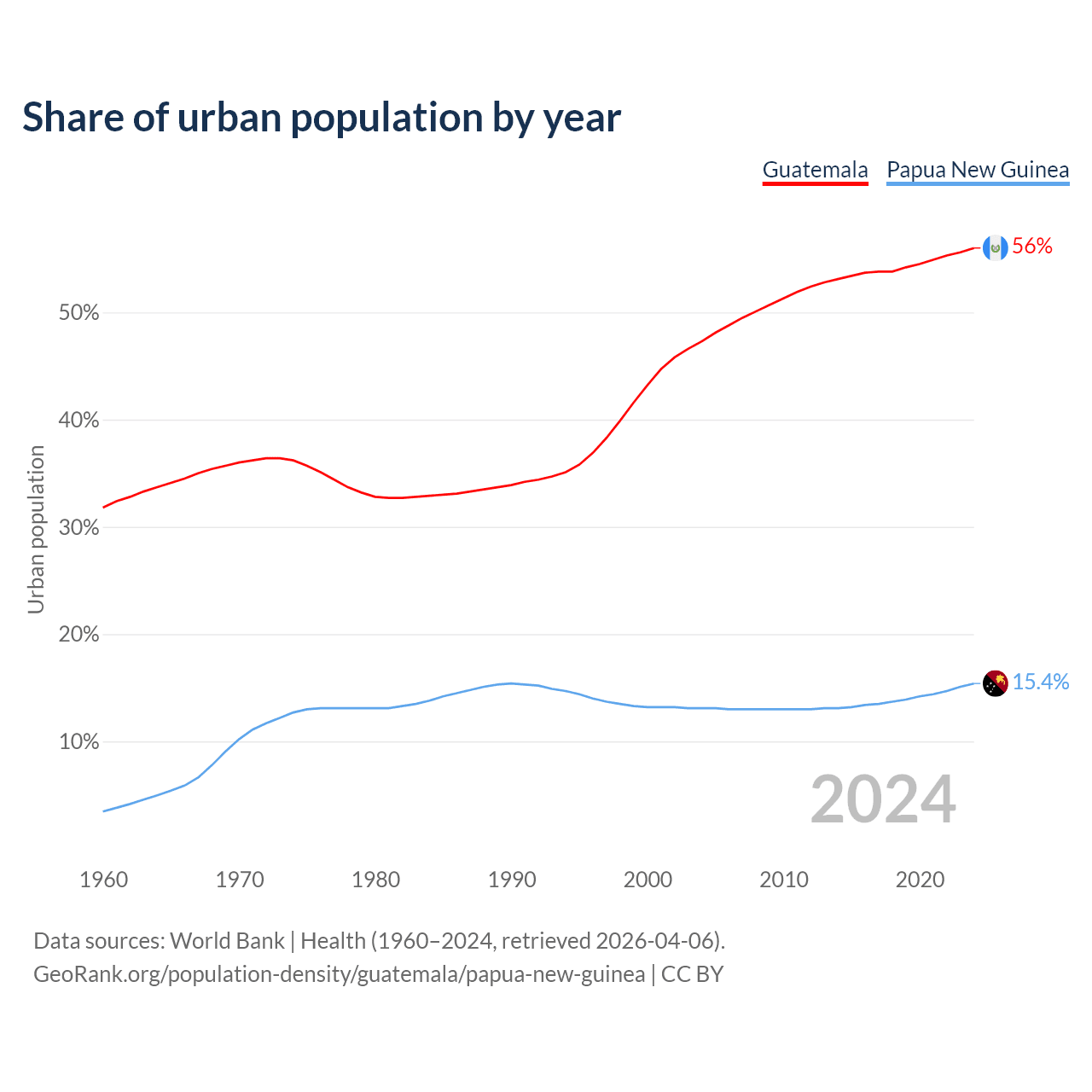 From 2004 to 2024, the share of urban population changed from 47.3% to 56% in Guatemala and from 13.1% to 15.4% in Papua New Guinea.