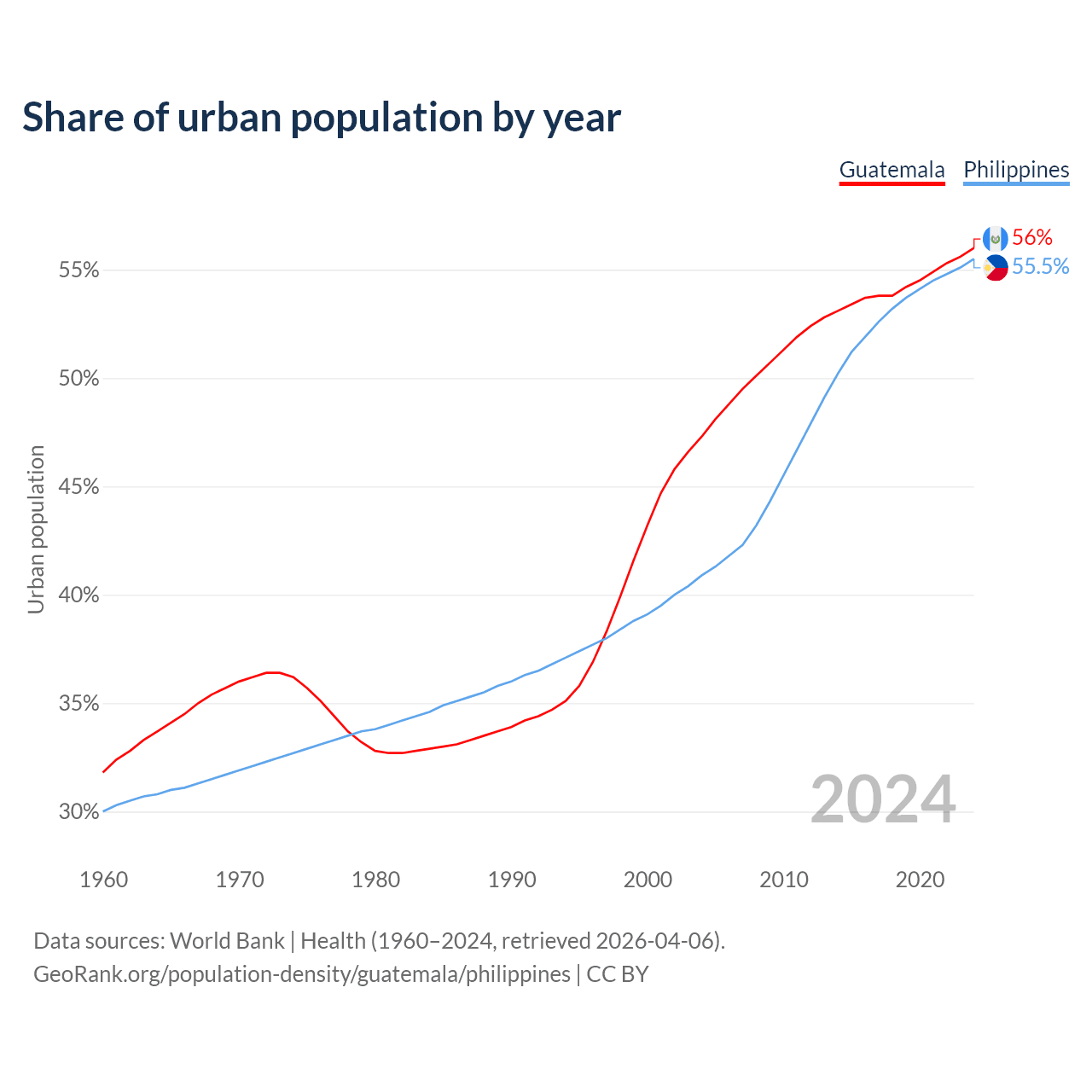 From 2004 to 2024, the share of urban population changed from 47.3% to 56% in Guatemala and from 40.9% to 55.5% in the Philippines.