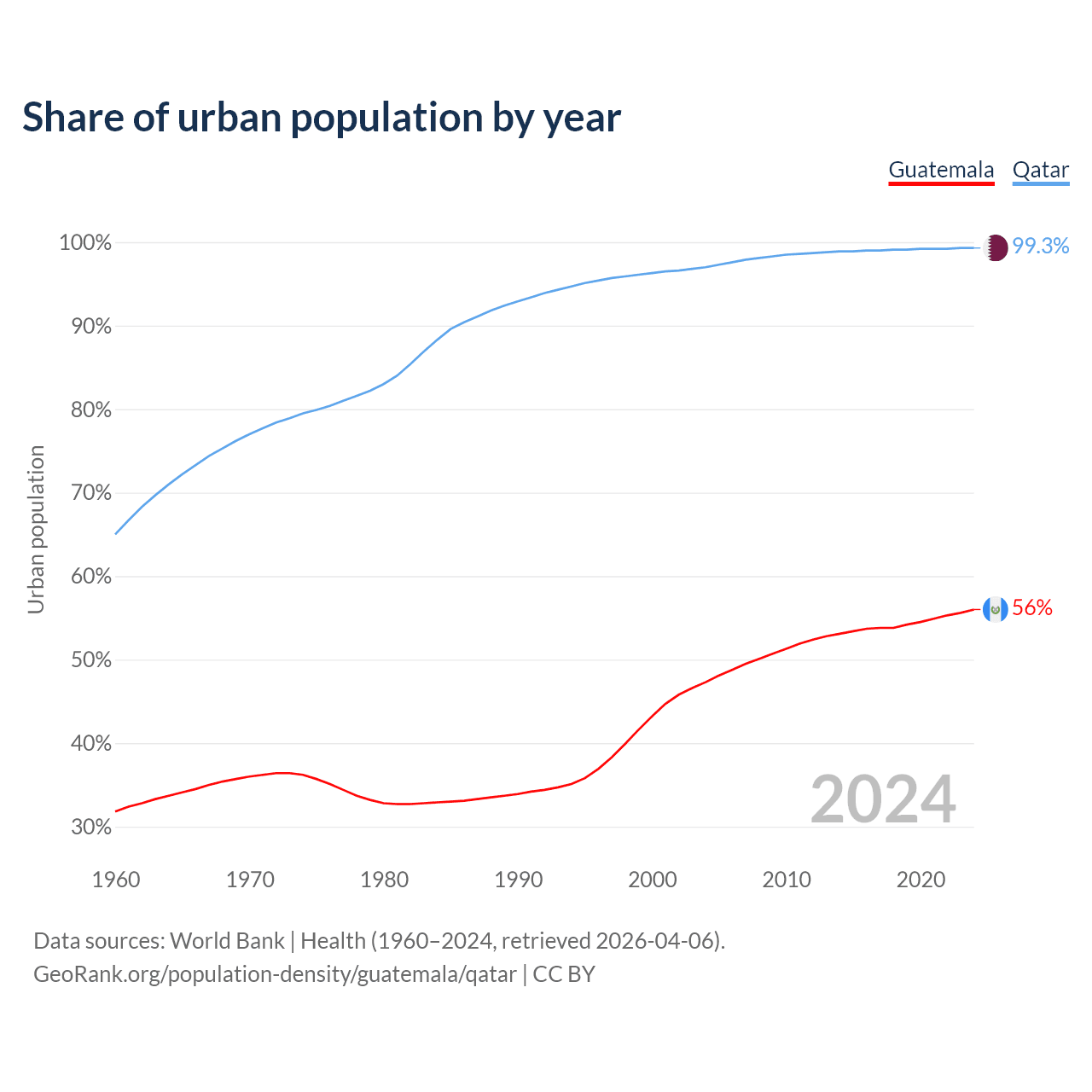 From 2004 to 2024, the share of urban population changed from 47.3% to 56% in Guatemala and from 97% to 99.3% in Qatar.