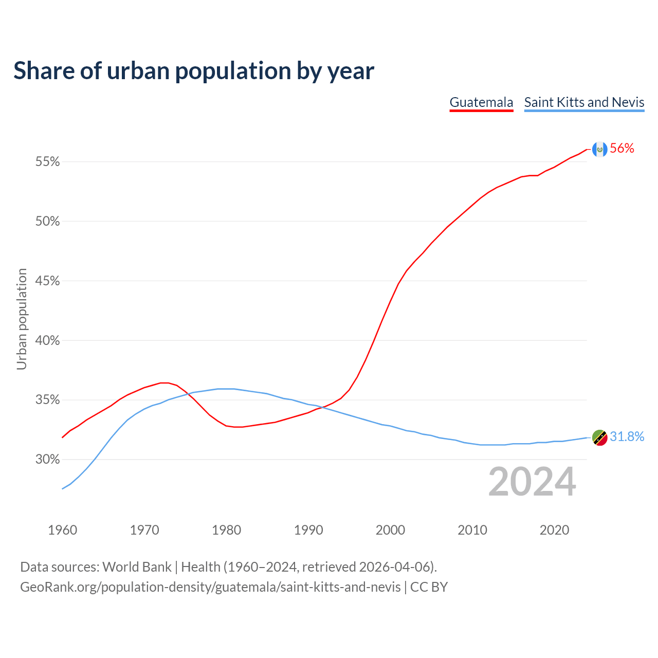 From 2004 to 2024, the share of urban population changed from 47.3% to 56% in Guatemala and from 32.1% to 31.8% in Saint Kitts and Nevis.