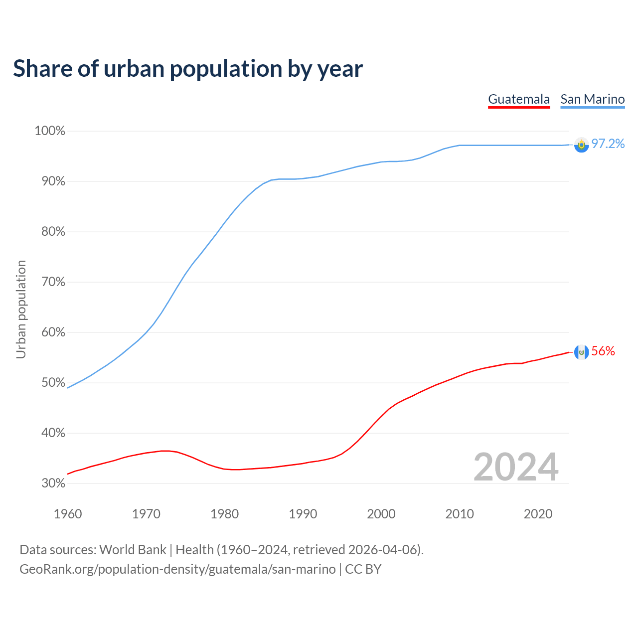 From 2004 to 2024, the share of urban population changed from 47.3% to 56% in Guatemala and from 94.2% to 97.2% in San Marino.