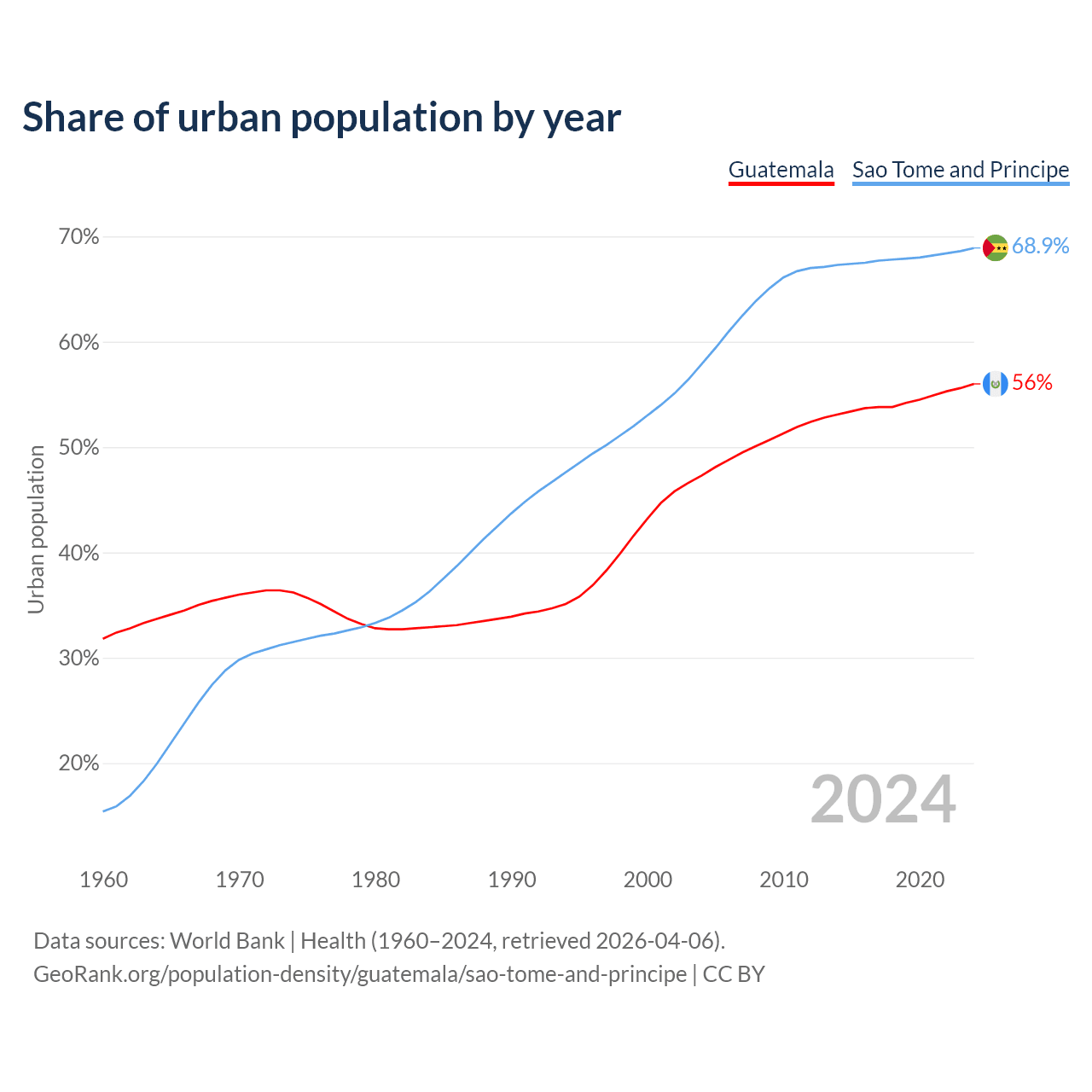 From 2004 to 2024, the share of urban population changed from 47.3% to 56% in Guatemala and from 57.9% to 68.9% in Sao Tome and Principe.