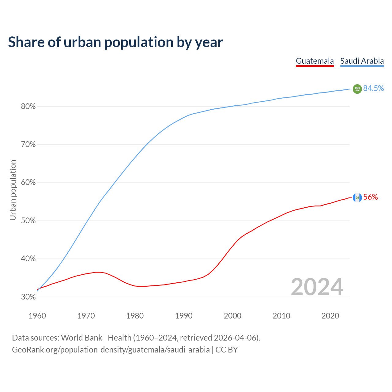 From 2004 to 2024, the share of urban population changed from 47.3% to 56% in Guatemala and from 80.8% to 84.5% in Saudi Arabia.