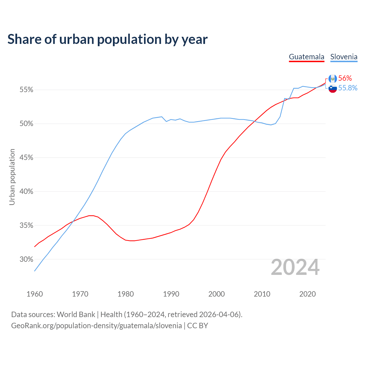 From 2004 to 2024, the share of urban population changed from 47.3% to 56% in Guatemala and from 50.7% to 55.8% in Slovenia.