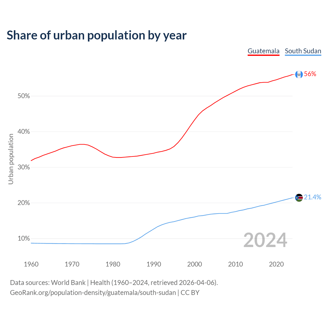 From 2004 to 2024, the share of urban population changed from 47.3% to 56% in Guatemala and from 16.8% to 21.4% in South Sudan.