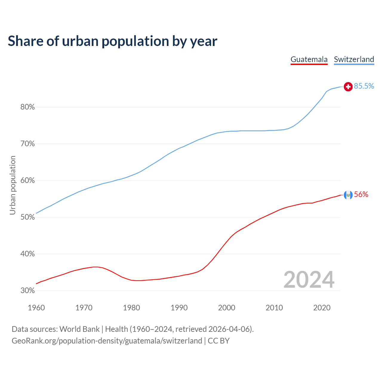 From 2004 to 2024, the share of urban population changed from 47.3% to 56% in Guatemala and from 73.5% to 85.5% in Switzerland.