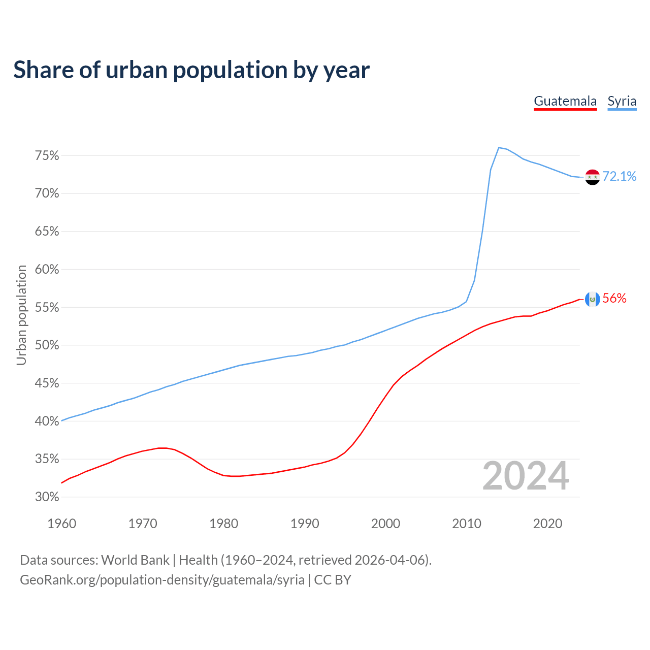 From 2004 to 2024, the share of urban population changed from 47.3% to 56% in Guatemala and from 53.5% to 72.1% in Syria.