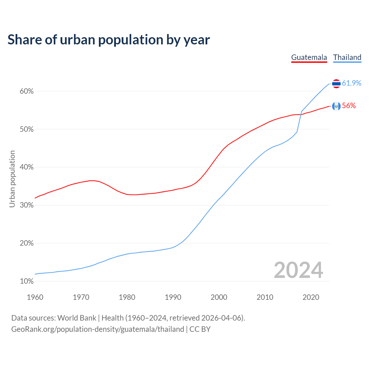 From 2004 to 2024, the share of urban population changed from 47.3% to 56% in Guatemala and from 36.8% to 61.9% in Thailand.