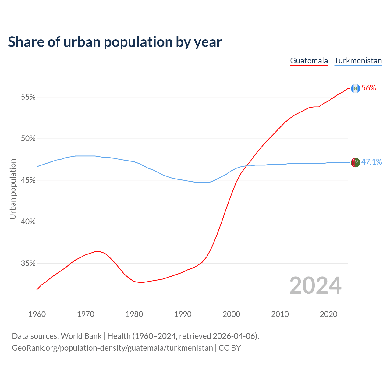 From 2004 to 2024, the share of urban population changed from 47.3% to 56% in Guatemala and from 46.7% to 47.1% in Turkmenistan.