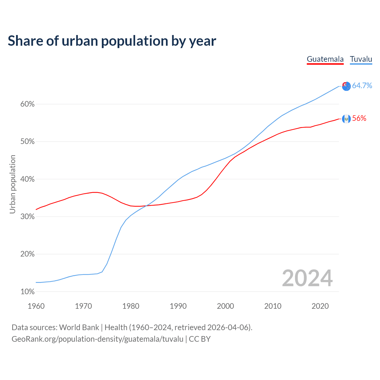 From 2004 to 2024, the share of urban population changed from 47.3% to 56% in Guatemala and from 48.4% to 64.7% in Tuvalu.