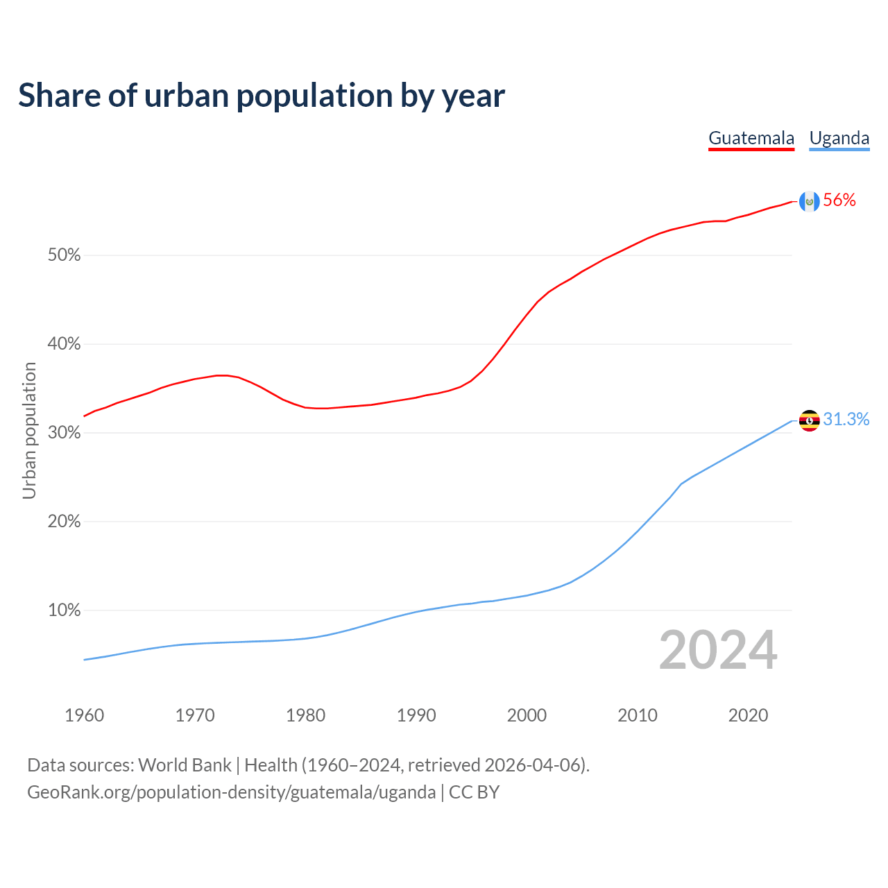 From 2004 to 2024, the share of urban population changed from 47.3% to 56% in Guatemala and from 13.1% to 31.3% in Uganda.