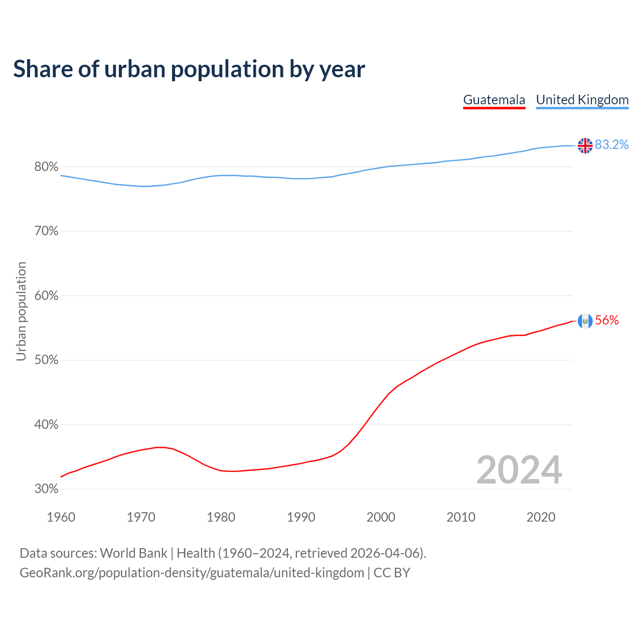 From 2004 to 2024, the share of urban population changed from 47.3% to 56% in Guatemala and from 80.3% to 83.2% in the United Kingdom.