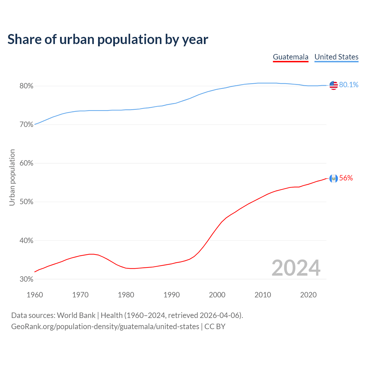 From 2004 to 2024, the share of urban population changed from 47.3% to 56% in Guatemala and from 80% to 80.1% in the United States.