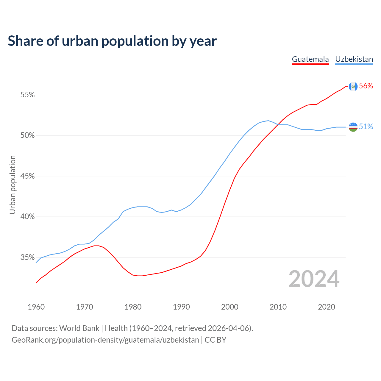 From 2004 to 2024, the share of urban population changed from 47.3% to 56% in Guatemala and from 50.6% to 51% in Uzbekistan.