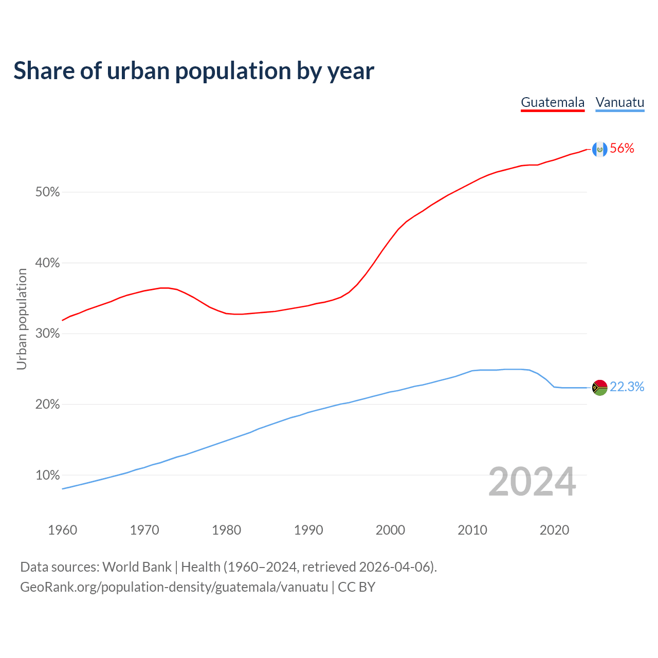 From 2004 to 2024, the share of urban population changed from 47.3% to 56% in Guatemala and from 22.7% to 22.3% in Vanuatu.
