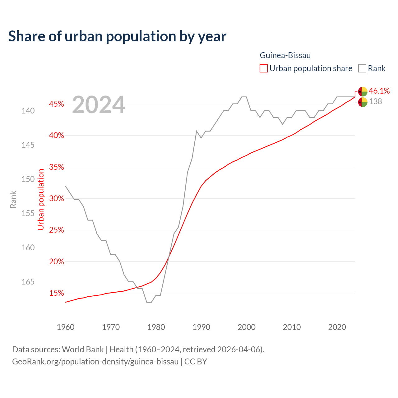 This chart shows the share of urban population in Guinea-Bissau from 1960 to 2024: 13.5% lived in urban areas in 1960, 36.8% in 2000, and 46.1% in 2024.
