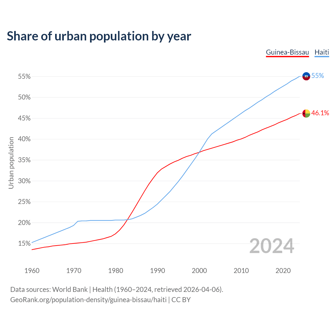 From 2004 to 2024, the share of urban population changed from 38.1% to 46.1% in Guinea-Bissau and from 41.9% to 55% in Haiti.