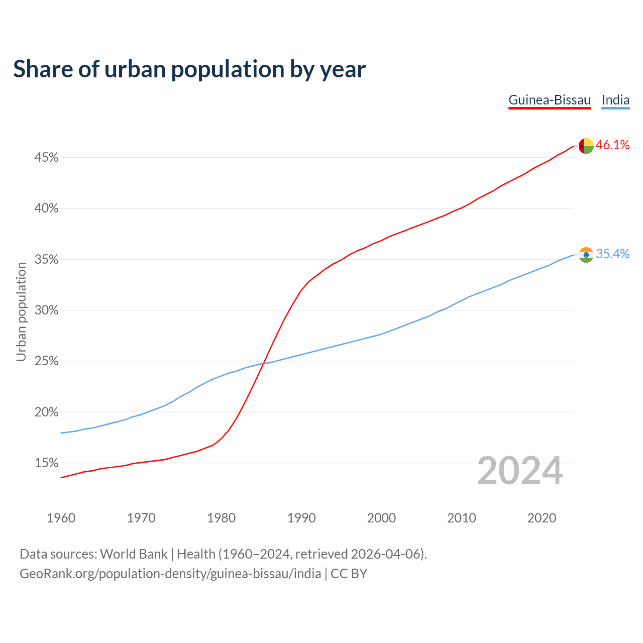 From 2004 to 2024, the share of urban population changed from 38.1% to 46.1% in Guinea-Bissau and from 28.8% to 35.4% in India.