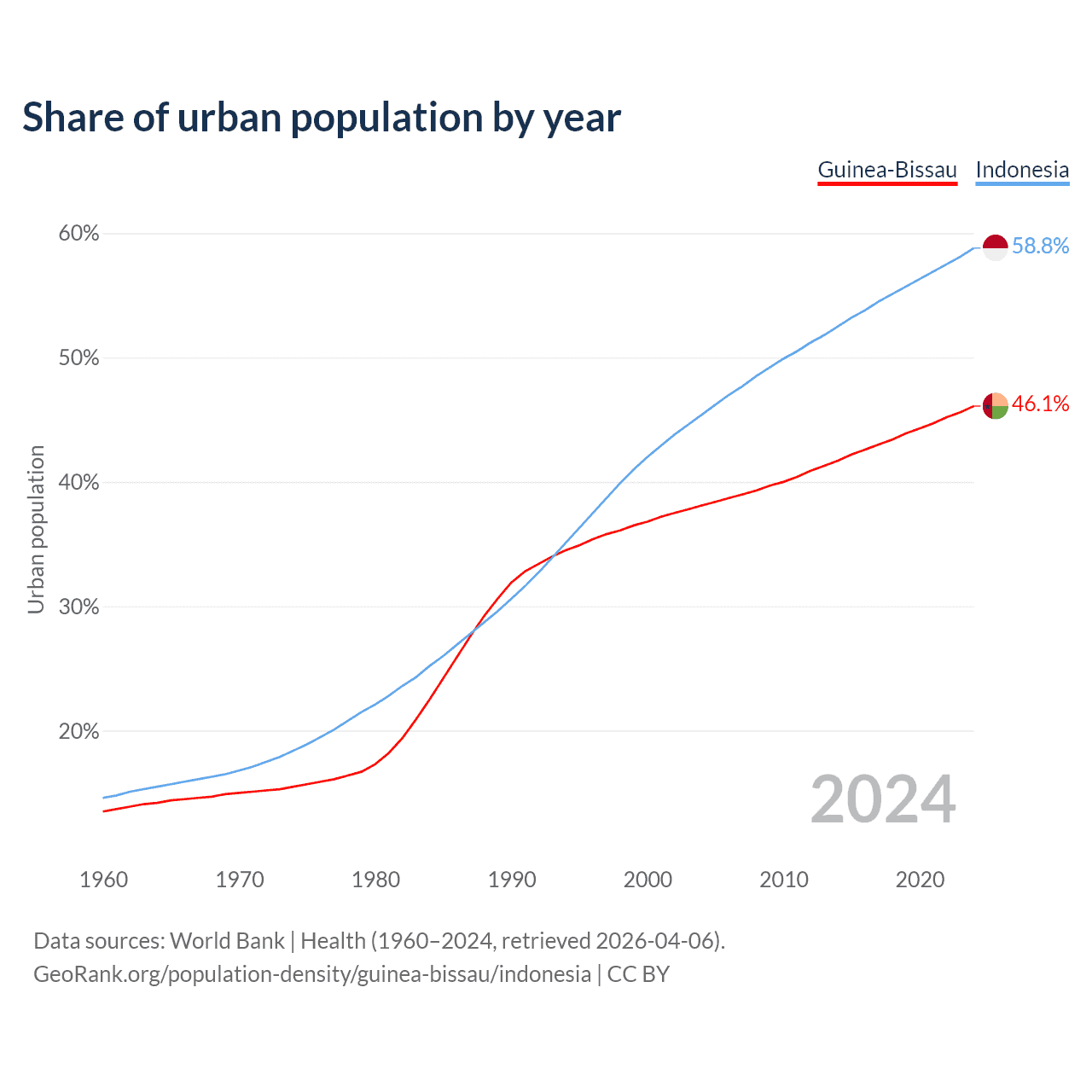 From 2004 to 2024, the share of urban population changed from 38.1% to 46.1% in Guinea-Bissau and from 45.4% to 58.8% in Indonesia.