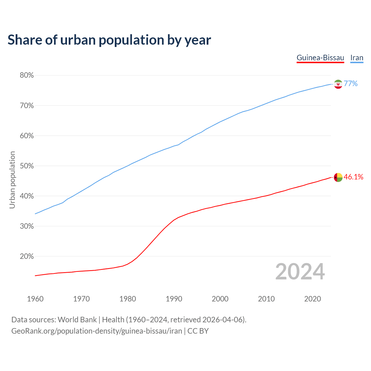 From 2004 to 2024, the share of urban population changed from 38.1% to 46.1% in Guinea-Bissau and from 67.3% to 77% in Iran.