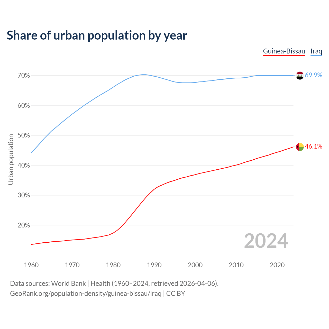 From 2004 to 2024, the share of urban population changed from 38.1% to 46.1% in Guinea-Bissau and from 68.2% to 69.9% in Iraq.