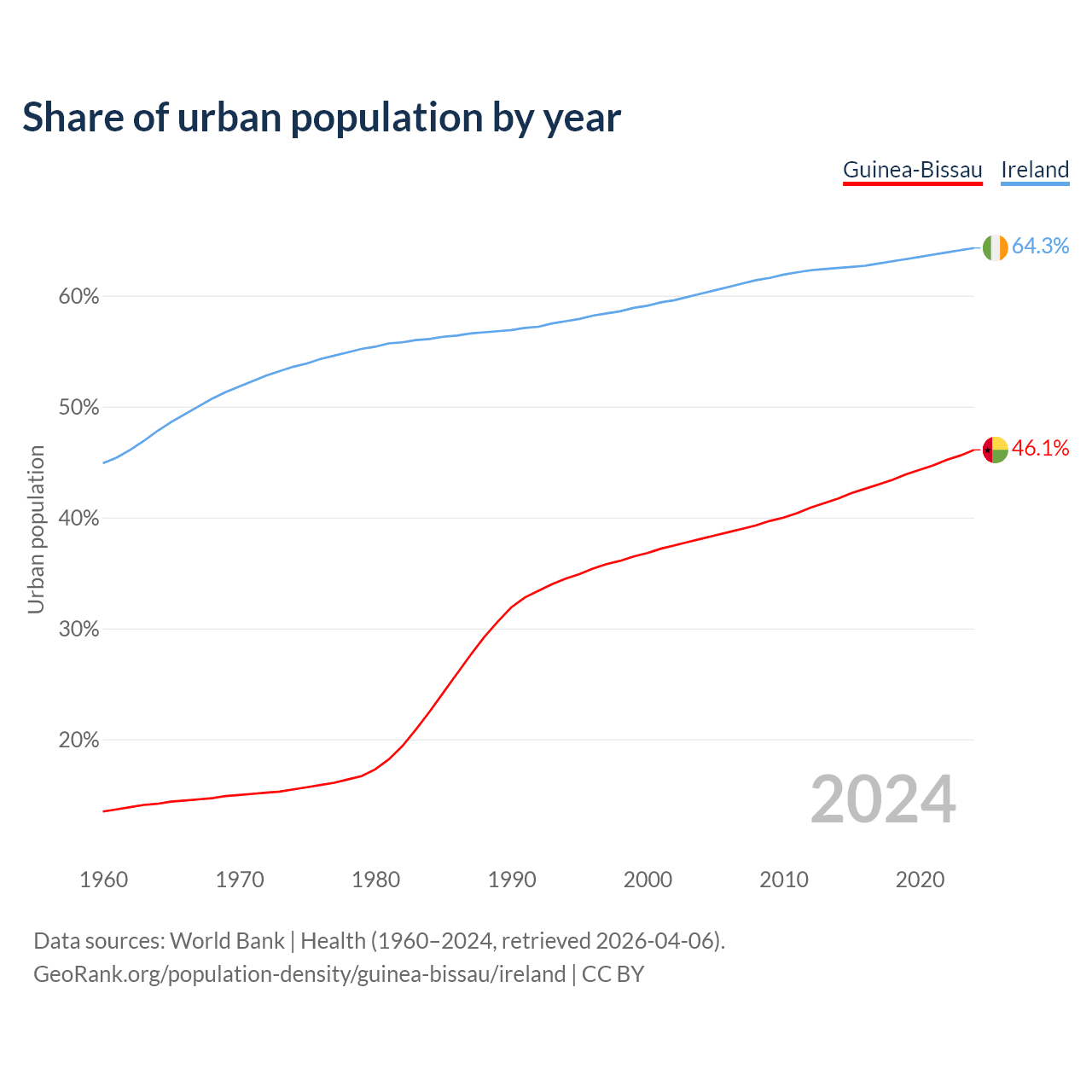 From 2004 to 2024, the share of urban population changed from 38.1% to 46.1% in Guinea-Bissau and from 60.2% to 64.3% in Ireland.