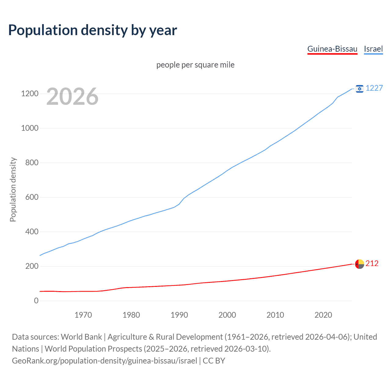 From 2006 to 2026, population density in Guinea-Bissau increased by 62.4%, compared to a 45.4% growth in Israel.
