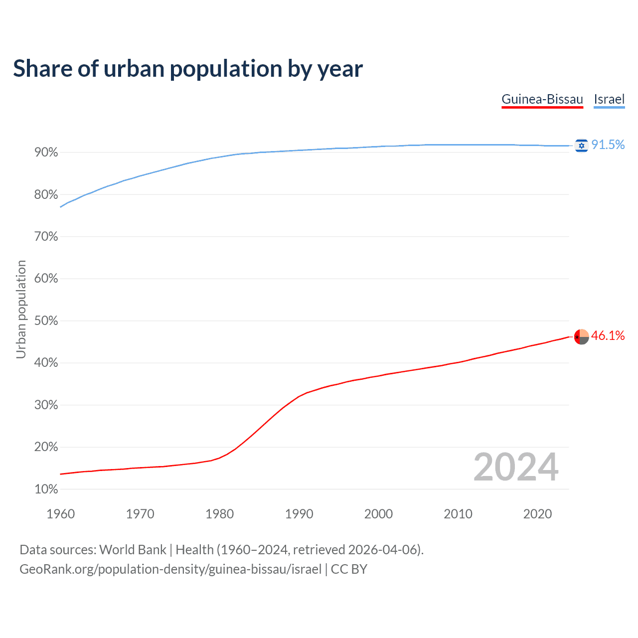 From 2004 to 2024, the share of urban population changed from 38.1% to 46.1% in Guinea-Bissau and from 91.6% to 91.5% in Israel.