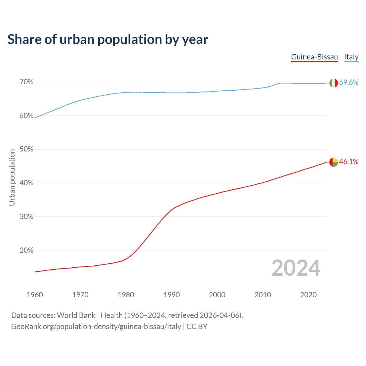 From 2004 to 2024, the share of urban population changed from 38.1% to 46.1% in Guinea-Bissau and from 67.5% to 69.6% in Italy.
