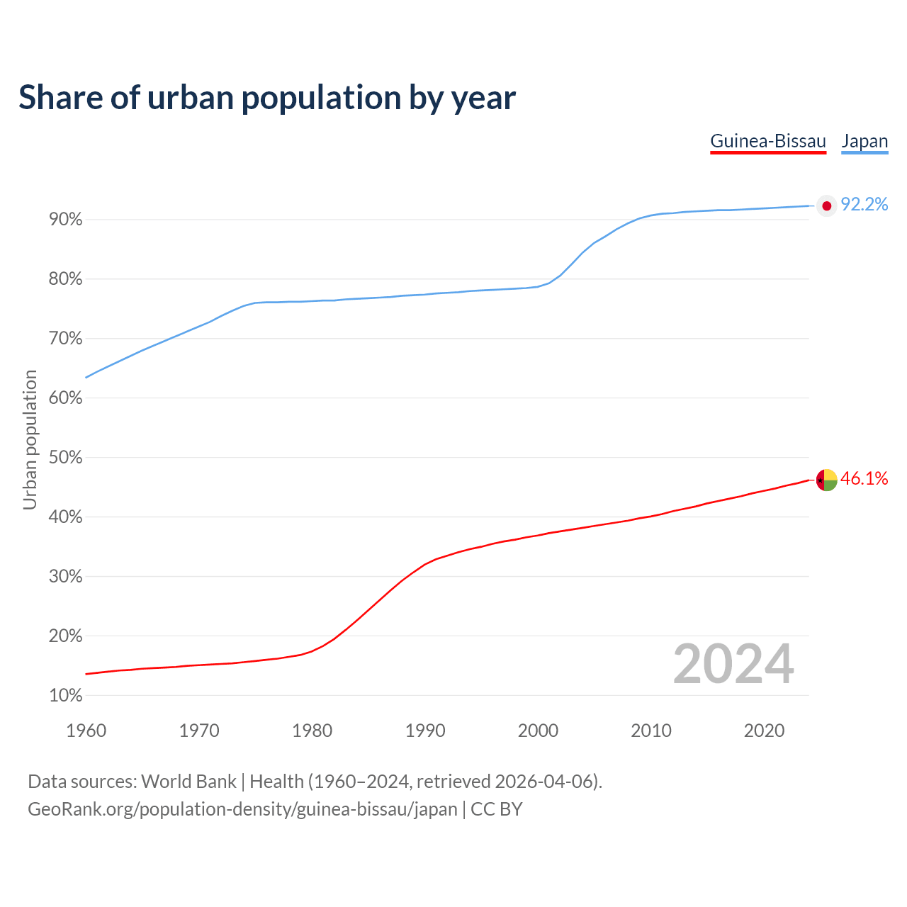 From 2004 to 2024, the share of urban population changed from 38.1% to 46.1% in Guinea-Bissau and from 84.4% to 92.2% in Japan.