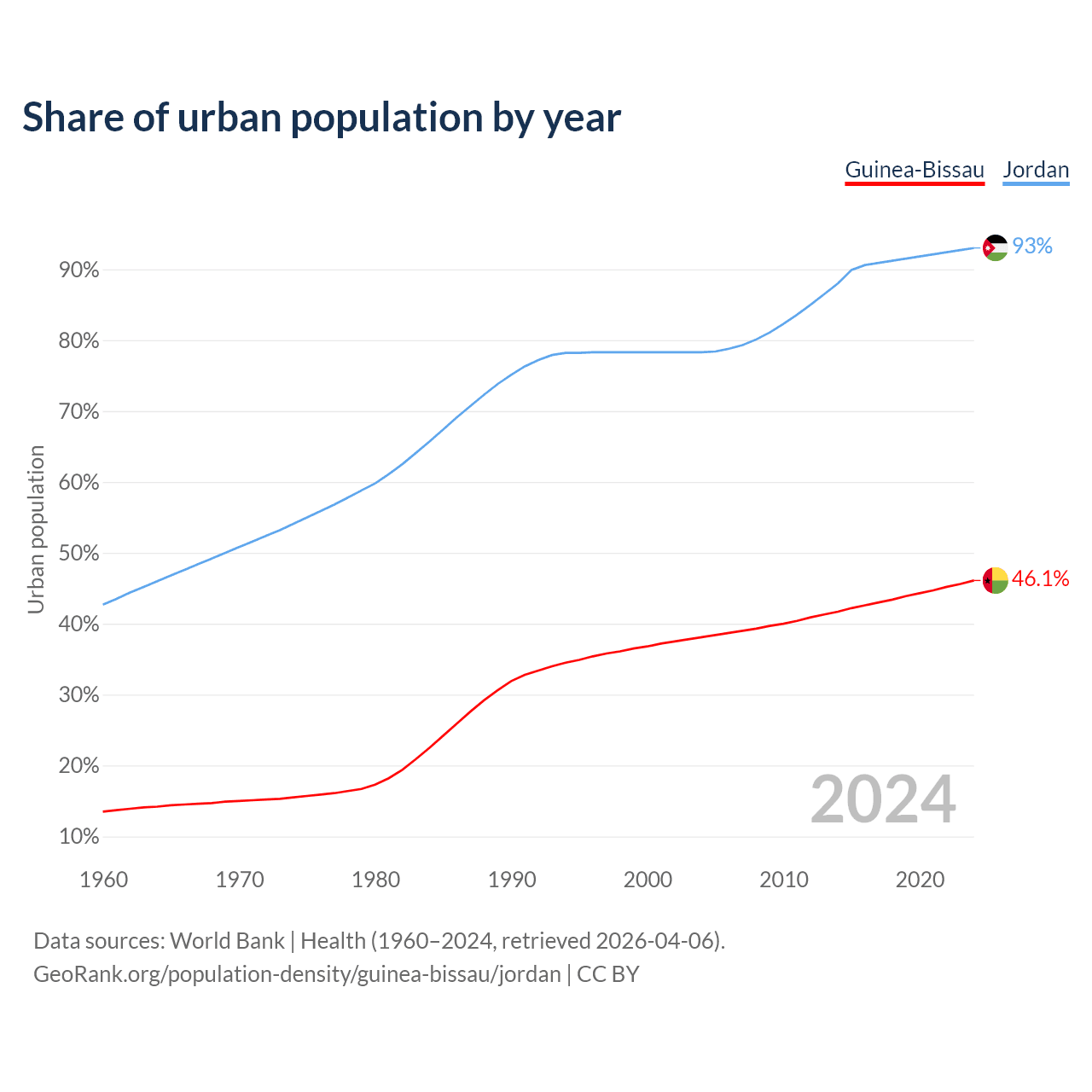 From 2004 to 2024, the share of urban population changed from 38.1% to 46.1% in Guinea-Bissau and from 78.3% to 93% in Jordan.