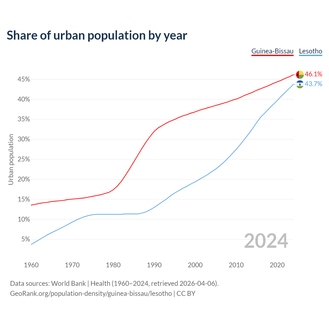 From 2004 to 2024, the share of urban population changed from 38.1% to 46.1% in Guinea-Bissau and from 21.8% to 43.7% in Lesotho.