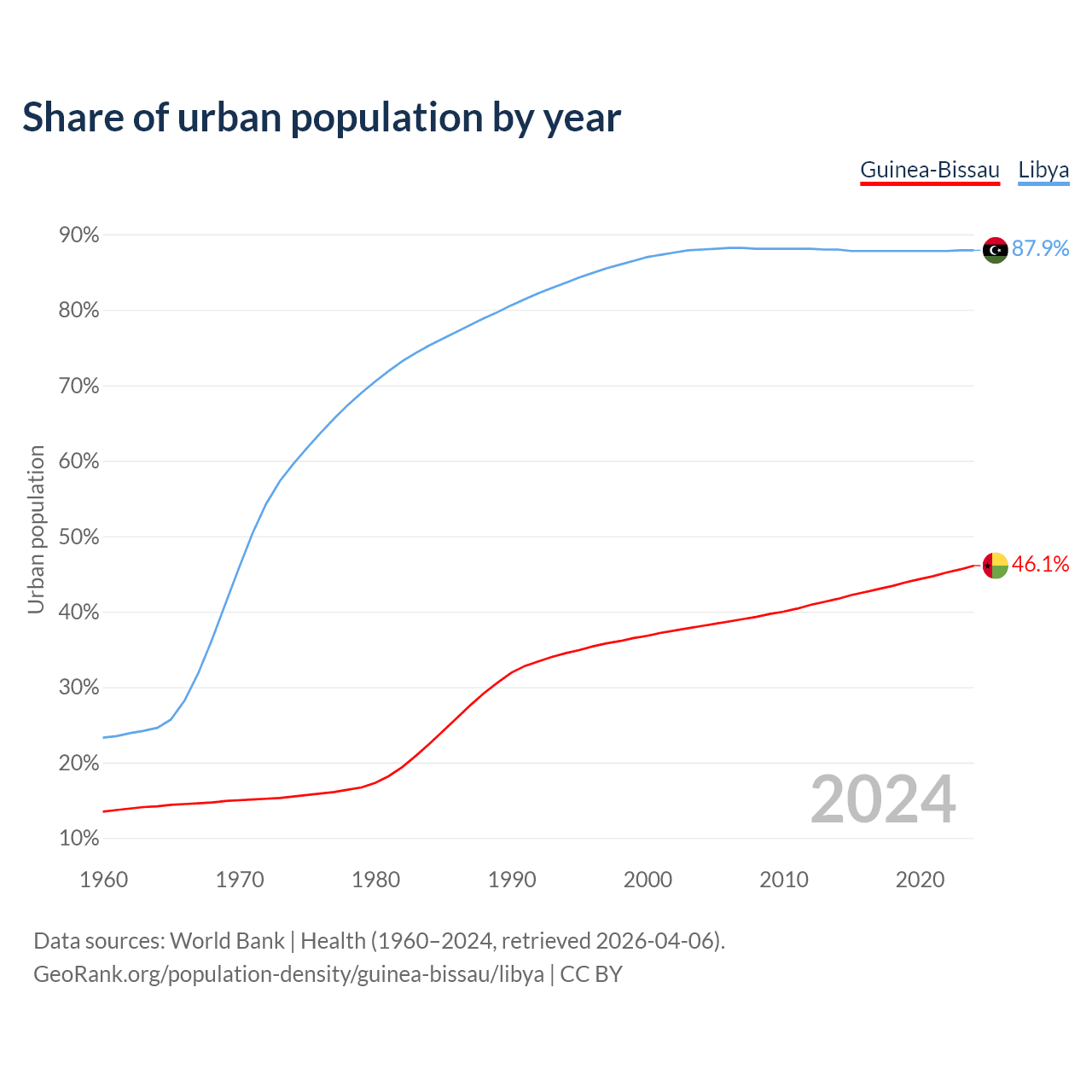 From 2004 to 2024, the share of urban population changed from 38.1% to 46.1% in Guinea-Bissau and from 88% to 87.9% in Libya.