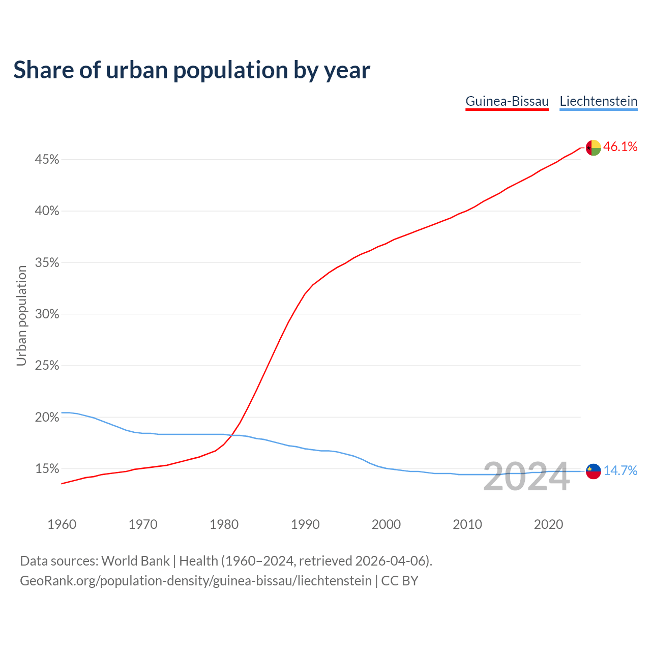 From 2004 to 2024, the share of urban population changed from 38.1% to 46.1% in Guinea-Bissau and from 14.7% to 14.7% in Liechtenstein.