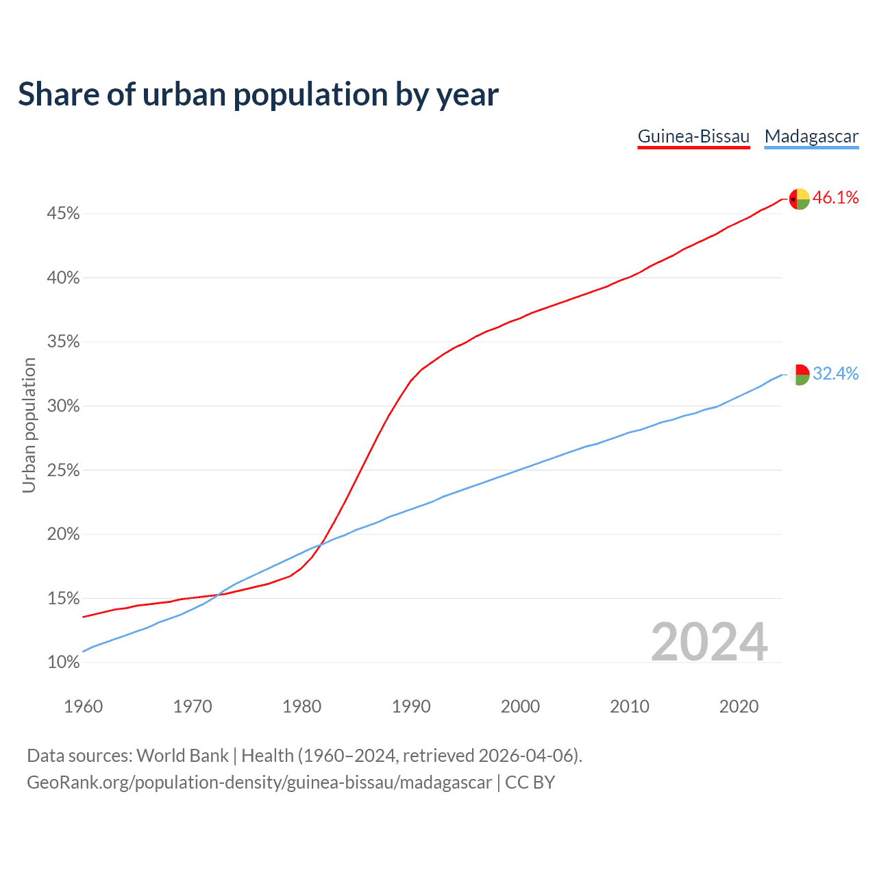 From 2004 to 2024, the share of urban population changed from 38.1% to 46.1% in Guinea-Bissau and from 26.2% to 32.4% in Madagascar.