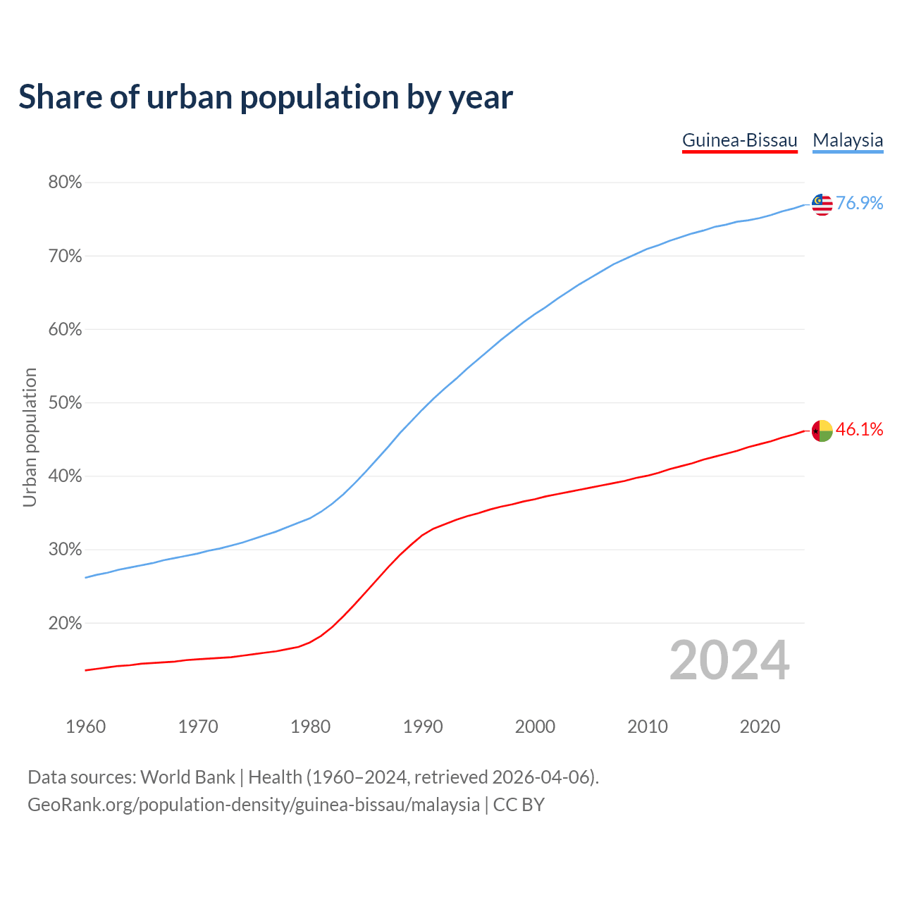 From 2004 to 2024, the share of urban population changed from 38.1% to 46.1% in Guinea-Bissau and from 66.1% to 76.9% in Malaysia.