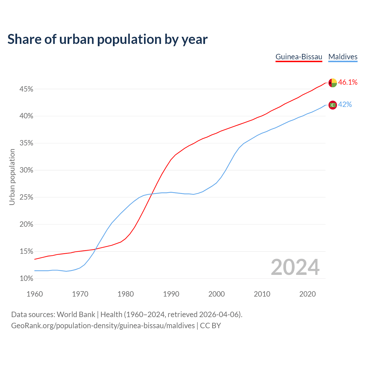 From 2004 to 2024, the share of urban population changed from 38.1% to 46.1% in Guinea-Bissau and from 32.9% to 42% in Maldives.