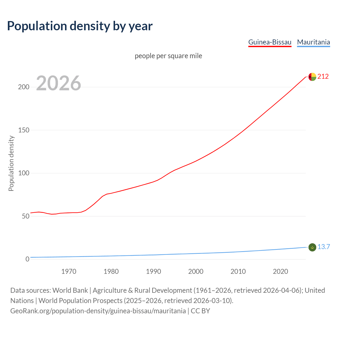 From 2006 to 2026, population density in Guinea-Bissau increased by 62.4%, compared to a 81.3% growth in Mauritania.