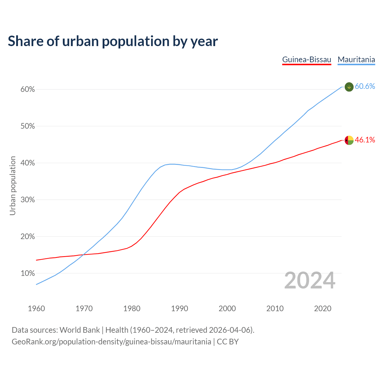 From 2004 to 2024, the share of urban population changed from 38.1% to 46.1% in Guinea-Bissau and from 39.6% to 60.6% in Mauritania.