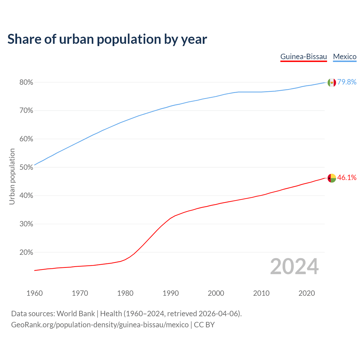 From 2004 to 2024, the share of urban population changed from 38.1% to 46.1% in Guinea-Bissau and from 76.3% to 79.8% in Mexico.