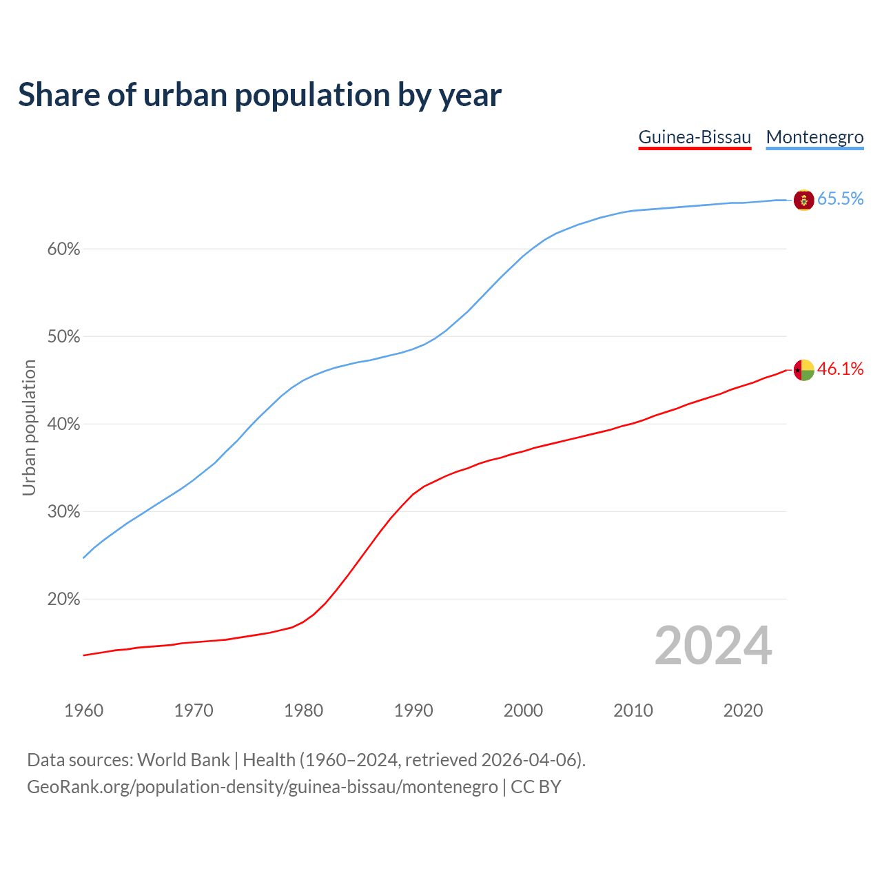 From 2004 to 2024, the share of urban population changed from 38.1% to 46.1% in Guinea-Bissau and from 62.2% to 65.5% in Montenegro.