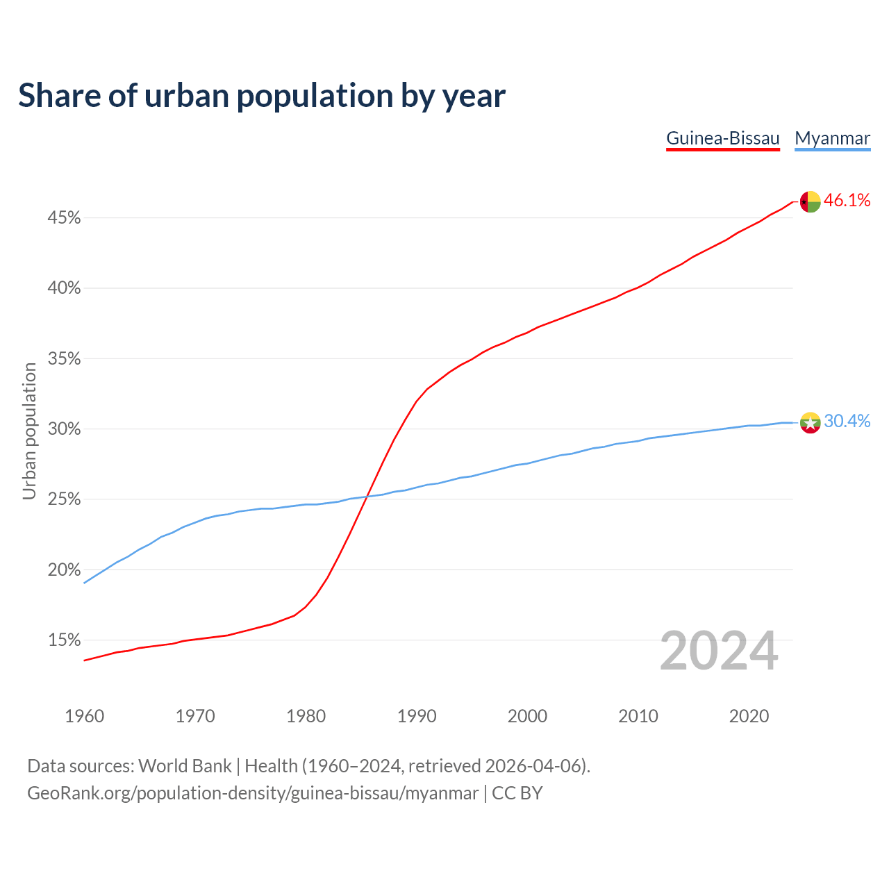 From 2004 to 2024, the share of urban population changed from 38.1% to 46.1% in Guinea-Bissau and from 28.2% to 30.4% in Myanmar.