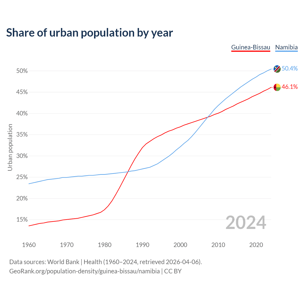 From 2004 to 2024, the share of urban population changed from 38.1% to 46.1% in Guinea-Bissau and from 35.5% to 50.4% in Namibia.