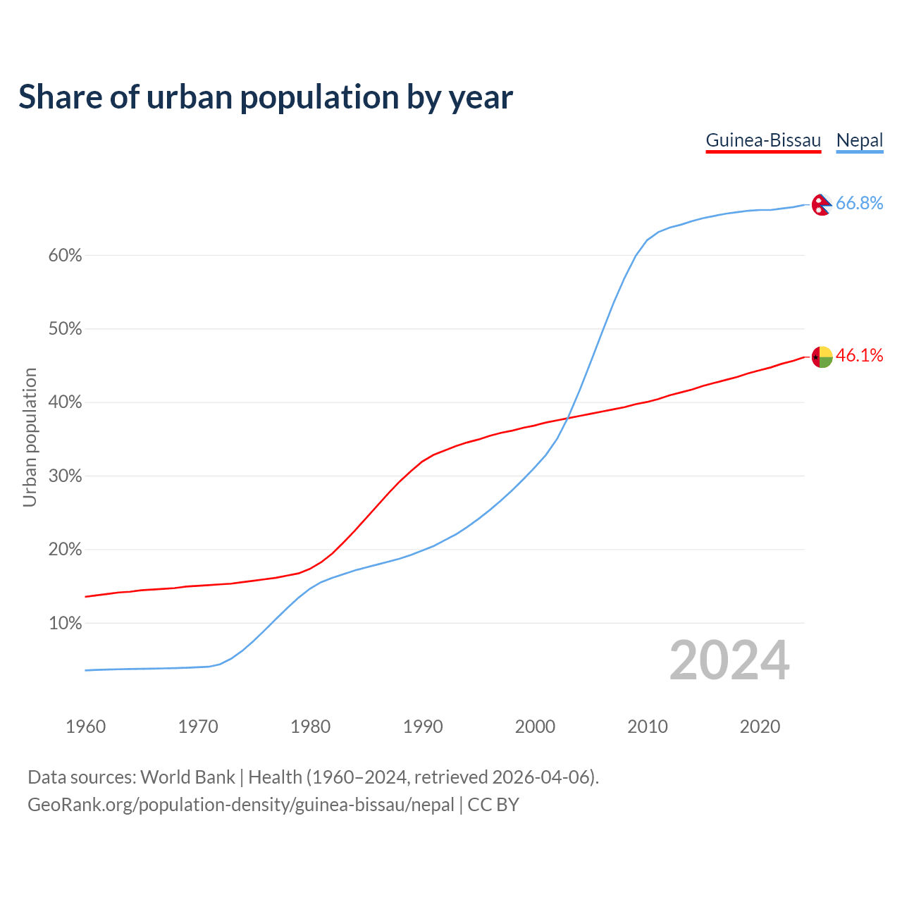 From 2004 to 2024, the share of urban population changed from 38.1% to 46.1% in Guinea-Bissau and from 41.6% to 66.8% in Nepal.