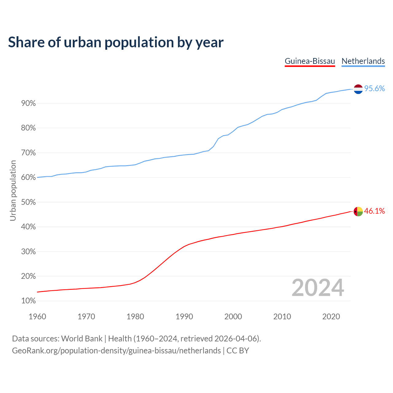 From 2006 to 2026, population density in Guinea-Bissau increased by 62.4%, compared to a 11.8% growth in the Netherlands.