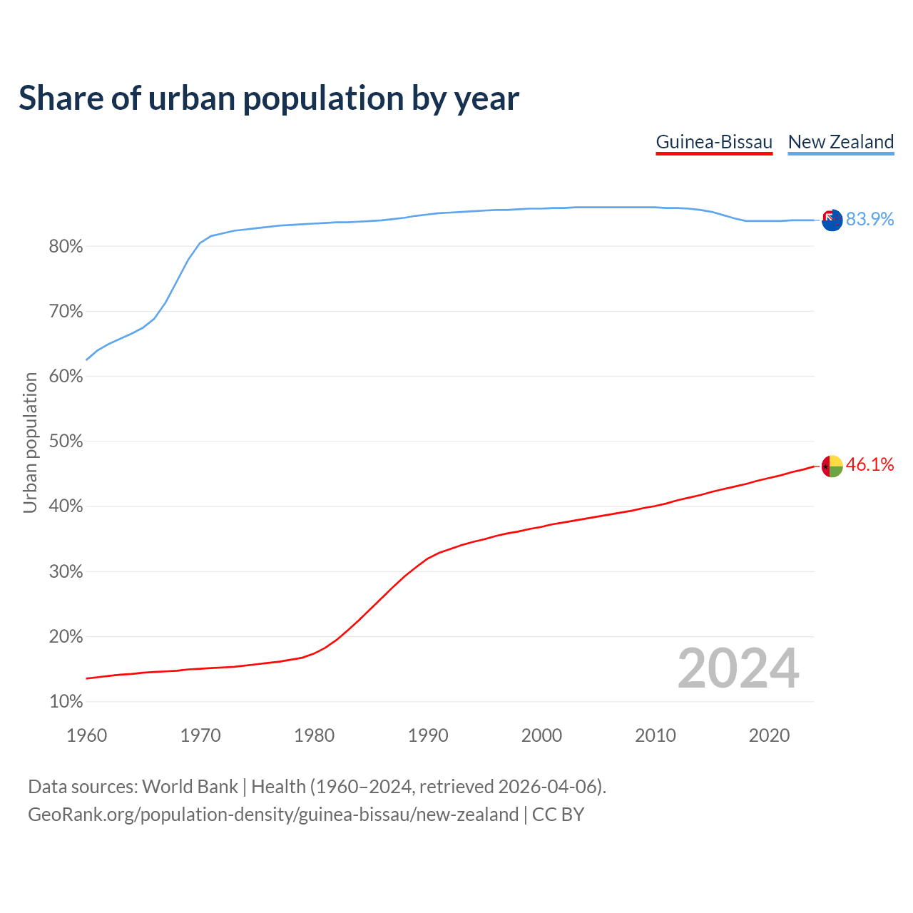 From 2004 to 2024, the share of urban population changed from 38.1% to 46.1% in Guinea-Bissau and from 85.9% to 83.9% in New Zealand.